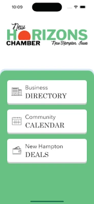 Download the New Horizons Chamber app today and be part of a strong, connected community. Support local businesses, build relationships, and celebrate the spirit of New Hampton, Iowa!